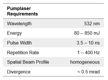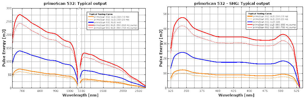 The OPO’s tuning range is covering 655 nm to 2700 nm. Paired with optional second harmonic generation (SHG), it can be extended to the UV and visible, providing tunable 330 nm to 520 nm output.